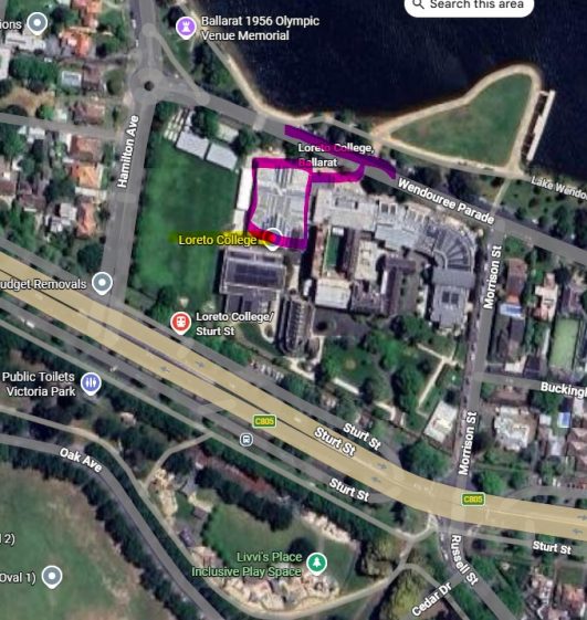 Loreto College: Courts 12-13 on the shores of Lake Wendouree is accessible vie the gate in the wall of the school on Wendouree Parade where there is on street parking.